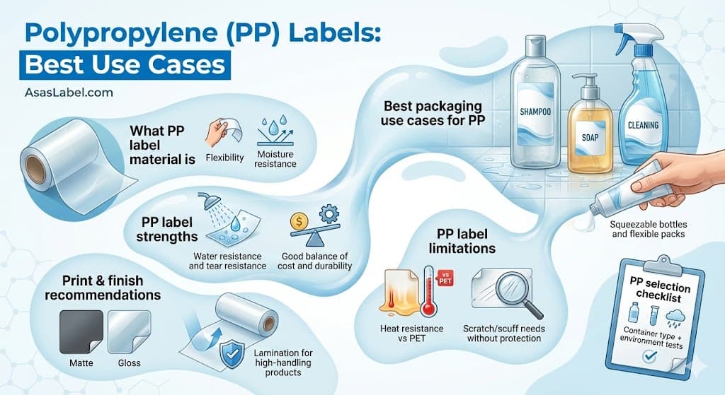 For a label to be genuinely recyclable, the facestock must generally match the polymer of the container. For example, a polypropylene (PP) label on a PP bottle allows the entire unit to be reground and melted into pellets without separation.